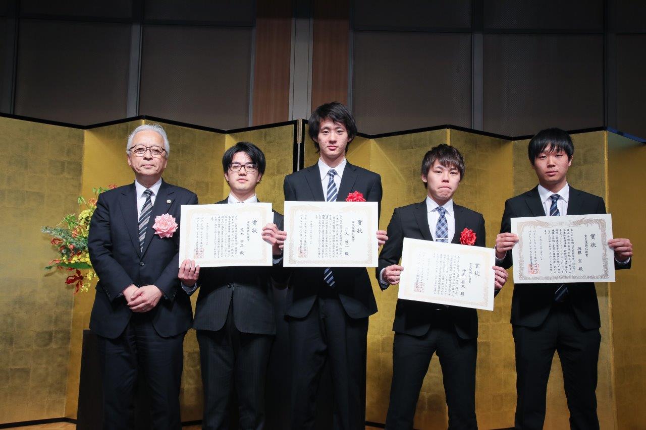 東日本大震災・熊本地震等の被災地復興に役立つ作品を表彰する震災復興応援賞は、阿南工業高等専門学校の荒木崇志さん、川人俊二さん、神元将太さん、坂根空さん、立道瑞樹さん(パテントコンテスト)、八戸工業大学の沓澤希実佳さん(デザインパテントコンテスト)が受賞した。