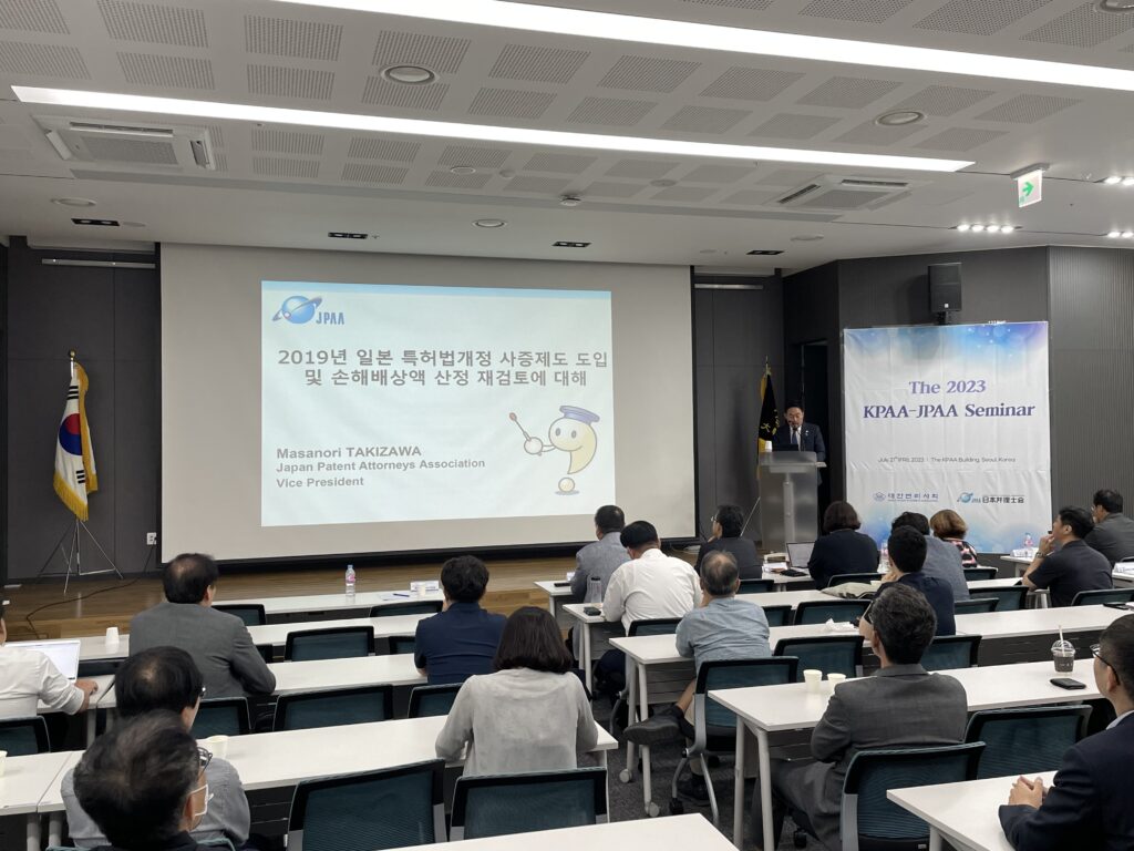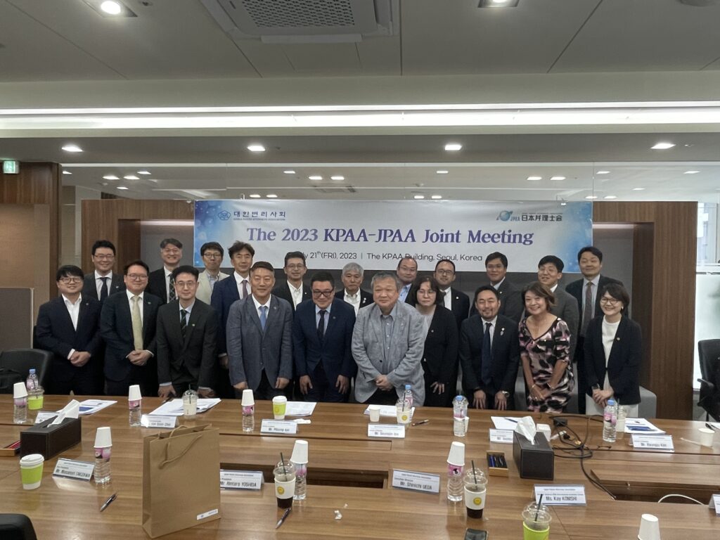 日本弁理士会-大韓弁理士会交流会を開催しました 令和5年7月21日(金)に、当会会長以下11名の代表団が、第42回日韓交流会(韓国・ソウル)に参加し、クローズドミーティング、オープンセミナー及びディナーレセプションを開催しました。 また、20日(木)には韓国特許庁を訪問し意見交換を行いました。 <JPAA-KPAA meeting> <JPAA-KIPO meeting>