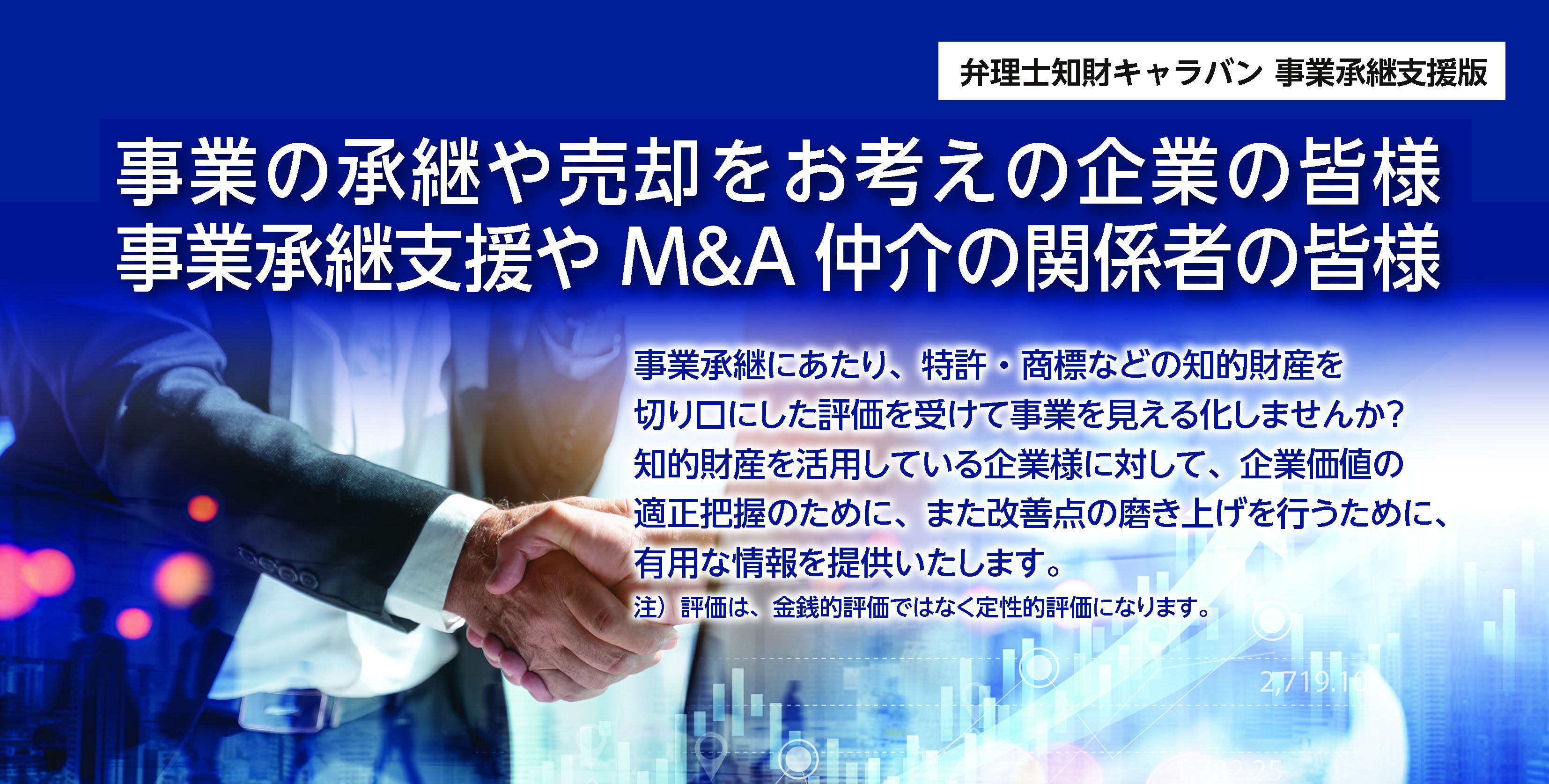 本事業は、日本弁理士会が派遣する弁理士2名が評価を担当し、評価費用は日本弁理士会が負担します。事業承継をお考えの企業様の他、金融機関やM&A仲介業者の方も評価をご希望の企業様がございましたら、ご応募頂けます。支援対象の募集・決定は随時行います(※予定枠に達し次第受付終了)。
