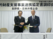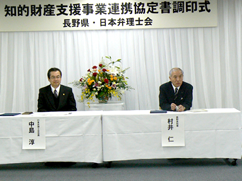 平成19年11月21日(水)、日本弁理士会と長野県との間での「知的財産の活用による地域の活性化と産業の振興のための協力に関する協定」(略称:知財支援協定)の締結に係る調印式が行われました。