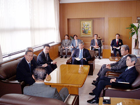 なお調印式に先立って、佐藤会長・竹内地方支援担当副会長・亀谷支援センター担当副会長・牛久知的財産支援センター長・井内副センター長は、協定当事者の島根大学学長と松江工業高等専門学校副校長と共に、島根県知事を表敬訪問いたしました。