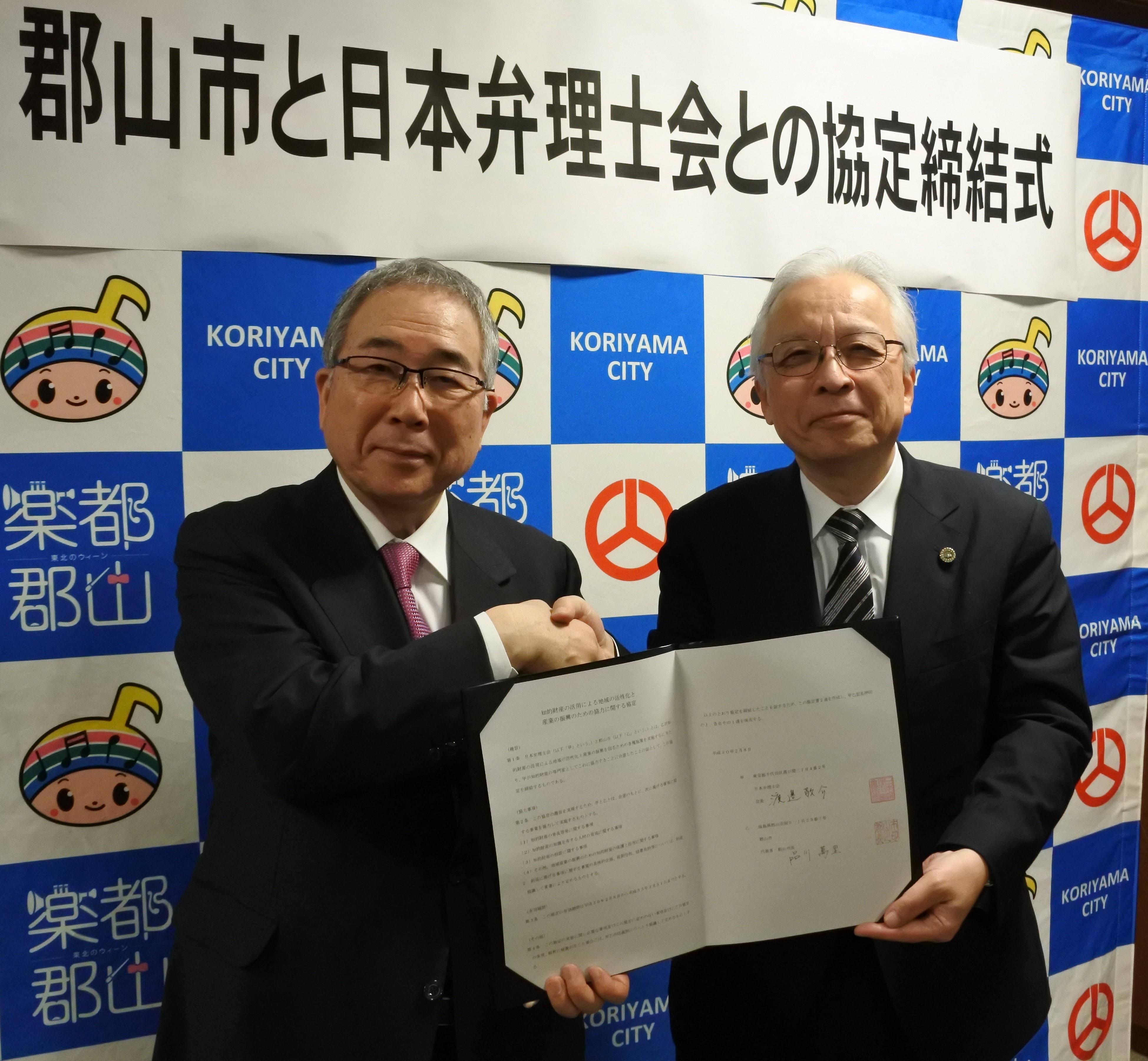 平成30年2月8日、郡山市と日本弁理士会は「知的財産の活用による地域の活性化と産業の振興のための協力に関する協定」を締結。締結式が郡山市庁舎にて行われた。締結式の当日には多くの報道陣が訪れ、郡山市長の品川萬里市長と当会の渡邉敬介会長が協定書に署名した。