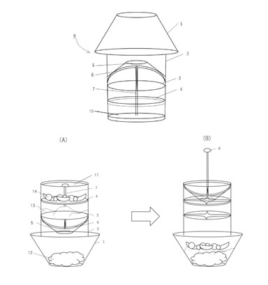 伊藤さんの発明は、異なる形状の複数の食材を個別に収容でき、容器に備えられたカッターを引き上げて各層を隔てる仕切りを破るワンアクションで、全部の食材を融合できるものだ。例えば果物とヨーグルト、グラノーラの場合、水分を含み重さのある果物を一番下に入れ、次にヨーグルト、一番上に軽量のグラノーラを入れる。重量のあるものを下に入れることで、容器を安定させることもできる。