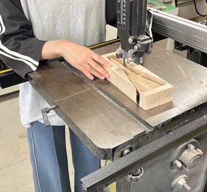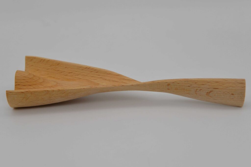加藤さんの作品のもう一つの特徴は、W字部分から把手につながる、ひねったような独特のカーブだ。紙の上のデザインではこの部分は真っ直ぐだったが、紙粘土の模型で少し斜めになっている方が握りやすかったのでカーブをつけた。さらに右利き、左利きのどちらでも使える握りやすさも考えられている。加藤さんは右利きだが、調理器具に左利き用のものがあることから、利き手に関係なく使える形を目指した。3Dプリンタで作ったサンプルを友人や先生に左手でも握ってもらい、指に当たるなどの不具合がないか確認したという。さまざまな検討を経て最終的なデザイン、サイズなどを決めてCNC切削機で木製の作品を製作した。この切削機が上下二方向からしか使えないという制約に対応するためにも、W字から把手へのカーブを工夫してユニークなデザインを導き出した。「授業の課題がなければ、この形は生まれなかったと思います」と語る加藤さんは、この部分のデザインが気に入っていると明かしてくれた。出来上がった作品を使って家でポテトサラダを作ってみて、ジャガイモを潰す、マヨネーズを混ぜるなど思っていた機能は実現できたと確認でき、家族には握りやすいと評価されたそうだ。