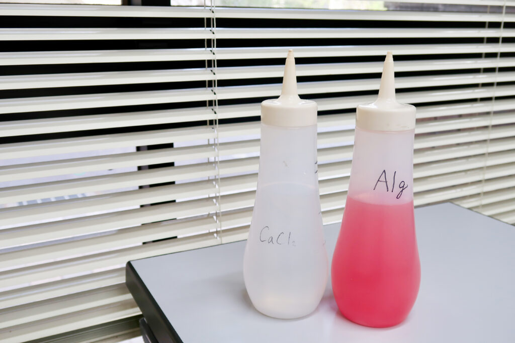 大塚:わかりやすいように染色したのですが、赤いものがアルギン酸、透明なものが塩化カルシウムです。それぞれの物質に性質があり、 2つを混ぜると瞬時にゲル化します。これを消火剤に応用することを思いつきました。消防ホースでこの2つの物質を放出すると、放出の際は液体で出せるが、ゲル化しそこに留まって火元を覆ってくれる。留まってくれるので、流れていってしまう水よりも再燃のリスクが下がるし、放出する量も少なくて済む。物質の両方のいいところを生かせると考えました。