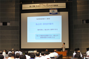 記念講演「知財で島根をもっと元気に」では、特許庁及び産業財産権について概要説明された後、近年の我が国の出願件数は横這い傾向であるが中小企業の出願件数は伸びていることや、特許権を所有する中小企業の営業利益率は大企業よりも高いことが紹介された。更に、侵害事件で訴えられた経験を糧に権利取得・活用を推進している企業の話など、規模の大小を問わず企業にとって知的財産の取得・活用が重要であることを改めて認識させられる内容であった。