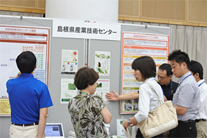第3部の交流会「会って聞いちゃおう!ブランド&アイデア活用法」では、ブースを出展した各事業者の事業紹介がなされた後、参加者は立食形式で自由にブースを回りつつ他の参加者と交流し、活発な情報交換・意見交換が行われた。各ブースでは、出展事業者の説明に熱心に耳を傾ける参加者の姿が見られた。また、島根県酒造組合より酒、松江市より和菓子の提供があり、島根ブランドを体感することができ好評であった。