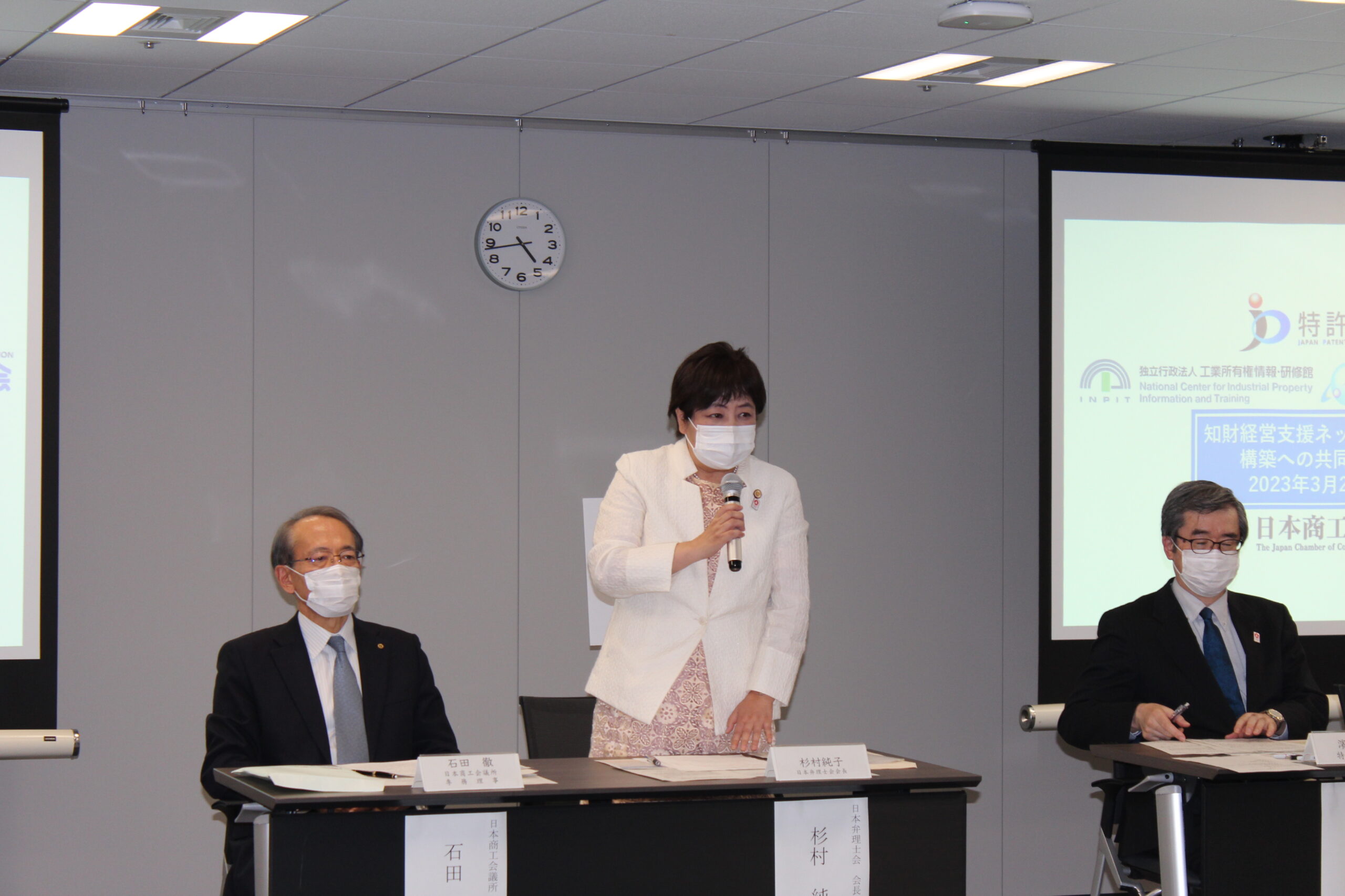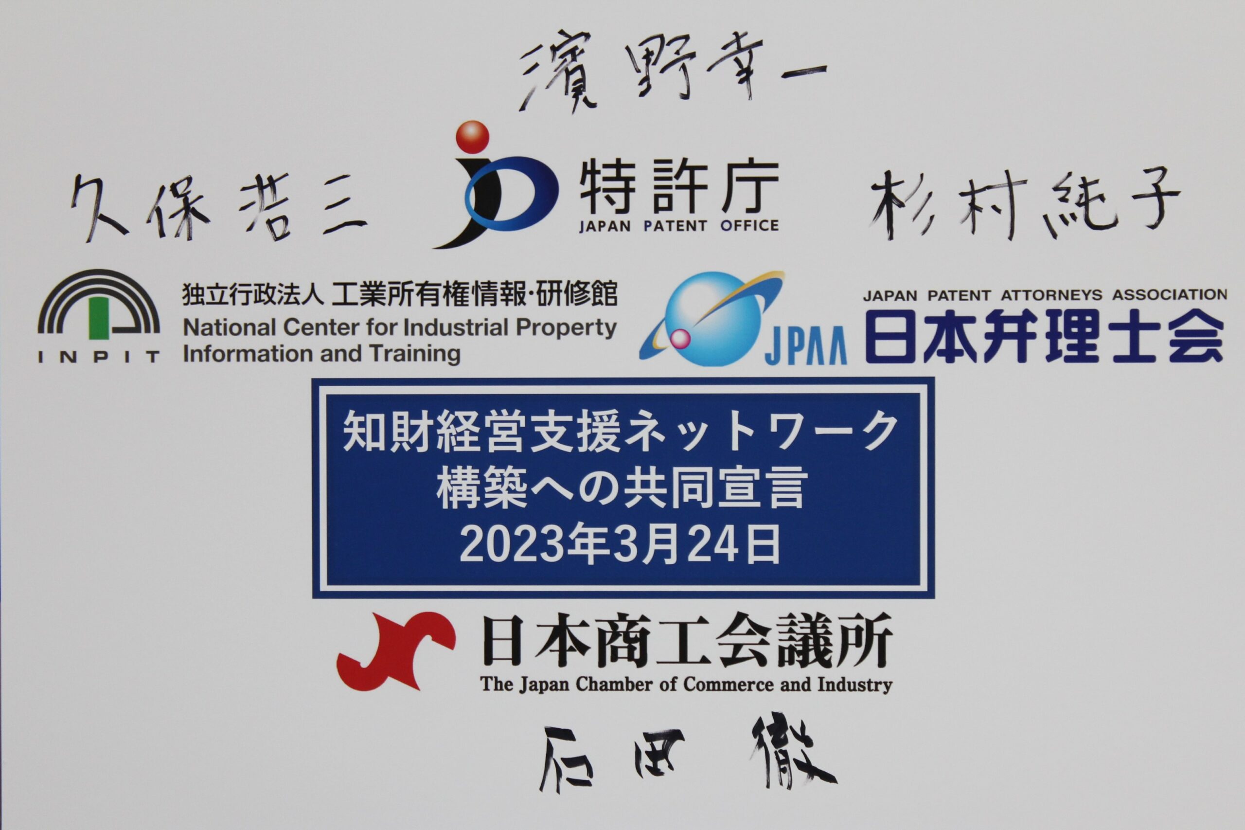 本日、知財経営支援のコアである特許庁、独立行政法人工業所有権情報・研修館(INPIT)、日本弁理士会と、地域中小企業支援の核となる日本商工会議所による「知財経営支援ネットワーク」を構築するために、4者で共同宣言を行いました。