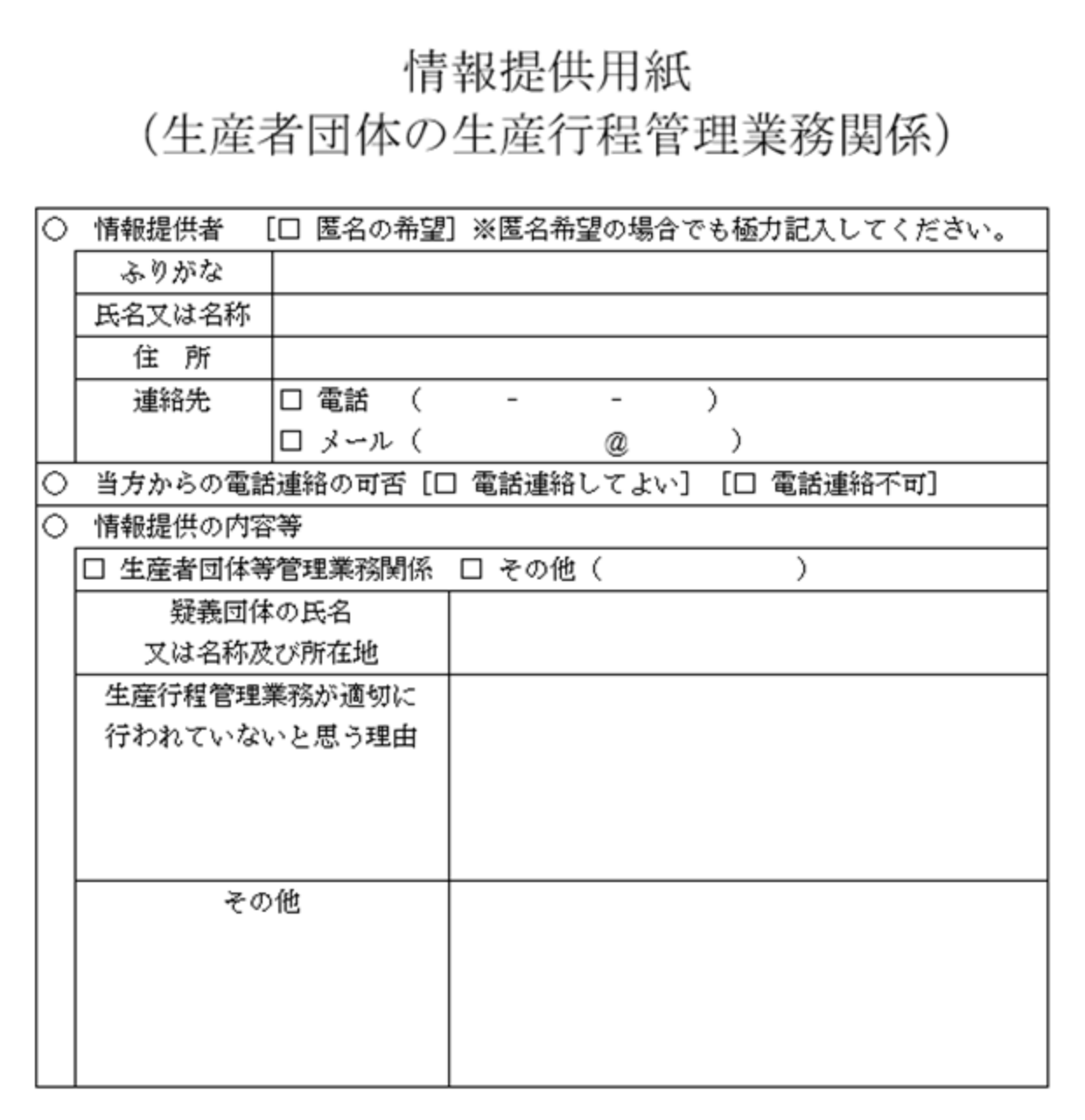 情報の詳細について農林水産省又は地方農政局の担当者が尋ねる場合がありますので、匿名希望の場合でも、極力、氏名、連絡先等をお伝えください。通報者の個人情報については、保持されます。また、案件処理に当たり、通報者の了解なしに個人情報を他へ伝えることはありません。