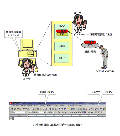 ジャストシステムは,日本語ワープロソフト「一太郎」とグラフィックソフト「花子」を製造・販売しています。すなわち、ジャストシステムは、これらのコンピュータプログラム自体を製造したり販売したりしていますが、これらをプレインストールしたパソコンを製造したり販売したりはしていません。インストールは専らこれらを購入したユーザによって行われています。ユーザはインストールした「一太郎」等をパソコン上で起動することにより、汎用のパソコンをワープロ機(装置)として使用しています。