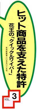 花王の「クイックルワイパー」花王(社長常盤文克氏)のフローリング用掃除具「クイックルワイパー」は、94年秋の発売以来、2年間で200億円以上の売り上げを記録したというヒット商品。しかし、人気商品ゆえに、好調な売り行きと同時に、模倣品の横行という悩みも抱えた。これに対して同社では、実用新案権や商標権、不正競争防止法に基づく権利を行使して、市場からの排除に成功する。望月牧郎特許部長(弁理士)は「損害額は微々たるものだが、会社の信用や消費者の保護を第一に考えて、積極的に手を打ってきた」と振り返る クイックルワイパーは、生活環境の変化や人口の高齢化を視野に入れて開発した商品。アルミと合成樹脂不織布を主な材料としているため、軽量で、力のないお年寄りや子供でも簡単に使える。ゴミを吸い取る部分には独自に開発した不織布(特許出願中)を使い、繊維でゴミを絡め取る仕組み。不織布は保持具の穴に挟み込むだけで固定でき、取り替えも簡単だ。そのうえ騒音とも無関係なので、病人の寝ている部屋の掃除にも向く。 こうした点が消費者に受け入れられ、たちまち市場に浸透するが、その人気が模倣者に狙われることになった。酷似品からコンセプト(考え方)が似たものまで合わせると、一時は十数種類の模倣品が出回った。 |