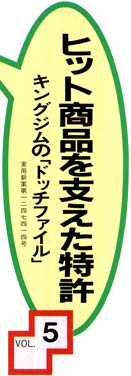 切れ目のない権利取得で競合品封じビジネス文具大手のキングジム(東京 社長宮本彰氏)は、主力商品のラベルライター「テプラ」のテレビCMにアイドルタレントを起用するなど積極的な宣伝活動を通じて、知名度を高めているが、その地歩を固めた商品の一つが、パイプ式とじ具を使用した「ドッチファイル」(登録商標)である。書類のヤマと悪戦苦闘するビジネスマンにとって、手放すことのできない優れものだ。二穴パンチ穴を開けた書類をとじる簡単な構造だが、長年にわたってほぼ独占状態を保ってきた秘訣は、新製品を開発するたびに、実用新案権などを途切れることなく取得し、アイデアの保護を図ってきたことにある。 このドッチファイルの出発点は、昭和39年に発売された「Gファイル」。優れた機能やデザインの製品に送られるGマーク商品に選定されたことにちなんで名づけたものだ。 従来、書類をとじる方法といえば、千枚通しで穴を明けた書類を紐でとじ込むというのが一般的で、書類が厚くなると紐を通すだけでも一苦労だった。これに対してGファイルは真っ直ぐな金属製のパイプに差し込むだけで簡単にとじることができることから人気を呼び、現在でも60%以上のシェアを獲得している。 |