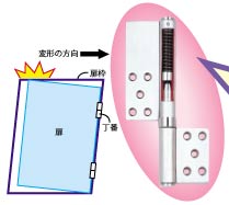 美和ロックと言えば「鍵」の最大手メーカー。その鍵メーカーで、鍵にも劣らないヒット商品となっているのが「対震丁番(たいしんちょうばん)」だ。丁番は開き扉などが一方の端を軸として開閉できるように扉枠に取り付ける金具のことで、「ちょうつがい」と発音した方が一般にはなじみ深い。 「地震になったらすぐに扉を開けて」とは、誰でも耳にしたことがある防災フレーズである。これは、図に示すように地震によって扉枠が変形し、扉の左上が枠に当たり、開かなくなってしまうからだ。こんなときでも、この対震丁番なら女の人の力でも楽に扉を開放することができるという。 その原理は至って簡単である。それは、丁番の軸の部分に埋め込まれたバネが縮んでドアが下がるため、変形した扉枠に扉が当たっていても、小さな力で扉を開けることができるようになる(写真はバネが見えるように外筒をカットした見本)。この対震丁番については、「基本特許の他に数件の周辺特許を取得して他社の参入を防いでいる」(製品計画部技術情報課の宮口聡弁理士) 昭和58年に発売された対震丁番であるが、その売り上げは阪神大震災を境に倍増したという。地震に対する意識の高まりの現れと言えよう。さらに、通常の丁番の代わりにこの対震丁番を取り付けるだけで、簡単に扉の地震対策を行うことができ、扉周りを通常と異なる設計にする必要がない点も、対震丁番の大きな特徴だ。ロングセラーとなっている背景には、このような簡便さも評価されているのではないだろうか。 |