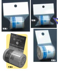 最近、コンビニやスーパーでは、商品を平面展示ではなく、吊り下げ展示が主流である。消費者の心理として、商品が平面的に並べられているよりも、吊り下げられているほうが、商品が目の高さにあり、また手に取りやすいからだ。実際、販売効率は平面展示よりも吊り下げ展示のほうが約4倍だそうである。 コマ巻のミシン糸も例外ではなく、大手繊維メーカではスーパーから吊り下げ展示を求められ立ち往生していた。そこで、包装資材に実績があり、種々の発明考案で新製品をものにしてきた石崎昭氏(石崎資材株式会社社長)に話が持ち込まれたのである。 まず、考えられるのは、写真1にあるように、吊り下げ用のタグのついた袋に糸を入れることである。しかし、これでは両脇につのが出っ張り、不格好である。 そこで、石崎氏は、スマートに見えるようつのを切っていった(写真2、3)。切っていくうちに袋の両脇が破れてコマがはみ出してしまった。破れたところで終わってしまうのが人情であるが、石崎氏は、破れても落ちないで止まっているのを見て、「これはおもしろいものができたぞ」と納得する。こうしてできたのが、写真4のループタイである。 |