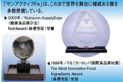 豊かな食生活の裏で、ミネラル、ビタミンなど特定の栄養素が足りない人が少なくない。これらを無理なく自然なかたちで摂取することができたら……。そんな願いに応えるのが、太陽化学(株)の開発した技術「ニュートリションデリバリーシステム(NDS)」。 NDS技術とは、ミネラル、ビタミンなど健康のために摂取が望まれる栄養素を、安定した状態で美味しく、体への吸収性が高くかつ体に負担をかけない状態で体内に運搬するシステム。ナノテクノロジーと乳化を制御する界面活性技術の組み合わせにより生まれた、これまでになかった全く新しい技術だ。 そのNDSを使ったヒット商品が平成8年に世に出た「サンアクティブFe」。商品そのものを一般消費者が直接目にすることはないが、各大手メーカーの乳飲料や乳製品に、鉄分補強剤として使用されている。世界の権威ある賞を受賞するなど、世界各国でもその技術力が認められ需要を伸ばしている。鉄分強化製剤の分野では後発だった太陽化学を、発売5年でトップシェアに飛躍させた革新的商品なのだ。また、WHO等の報告によれば、鉄分は世界で最も不足している栄養素で、世界人口の約70%が鉄不足の状況にあるという。これはまさに時代の求める商品でもあったわけだ。 |