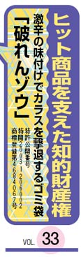 近年、カラスの増加によるさまざまな被害が社会問題となっている。カラスは有害鳥獣として狩猟鳥に指定されているが、罠を見破るほど賢い鳥で、捕獲は難しい。都市のカラス対策で最も有効なのは、餌である生ごみを食べられないようにすることだ。 プラスチック樹脂メーカーのミツギロンが開発したごみ袋「破れんゾウ」は、カラスが嫌う天然唐辛子濃縮液カプサイシンをラミコートした、強度に優れた製品である。一般のごみ袋は筒状にフイルムをつくりながら、熱着してカットするのに対し、「破れんゾウ」はポリエチレン樹脂の極薄フイルムをカットした延伸ヤーンを筒状に編み、カプサイシンをラミコート、底を縫製して袋にする。さらにカプサイシンが利用者の肌に触れないように、裏返してラミコート面を内側にする。 カラスは嗅覚が鈍い反面、視覚と味覚は人間の3倍鋭いという。「破れんゾウ」は、カラスが懸命につついても小さな穴しか開けられない上に、カプサイシンで激辛の味付けが施されているため、中の生ごみを食べられない。 その効果は、カラス博士として知られる宇都宮大学農学部・杉田昭栄教授の実験でも認められ、多くのマスコミで取りあげられた。カラス撃退の決定打として、対策に頭を悩ます自治体からの問い合わせも殺到したという。 |