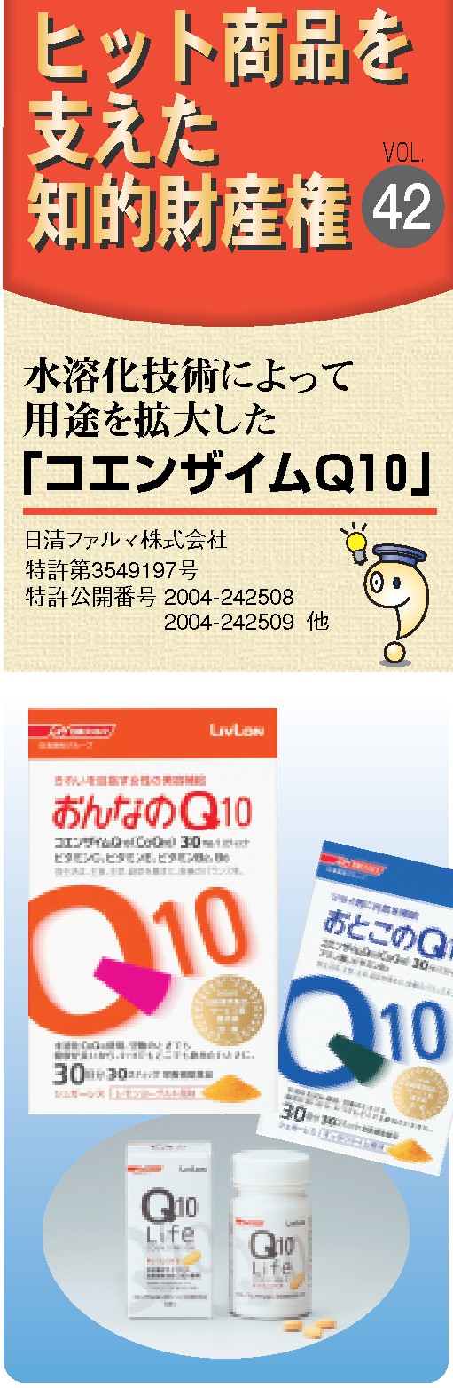 食品分野に進出するに当たって、国内外のCoQ10に関する特許を調査したところ、食品特許は少なかったという。この結果から、同社はCoQ10のサプリメントなど健康食品に関して安定性・吸収性・効果改善技術のさまざまな特許を出願して、この技術による優位性を確保する万全の態勢を整えたという。水溶化CoQ10に関しては、親会社である株式会社日清製粉グループ本社にて「アクアQ10」の名称で商標も取得している。(第4828452号、第4880268号)