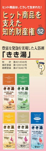 入浴剤市場では、国内外の多様な商品が展開されている。「きき湯」は成形性、強い発泡性による浴湯の汚れというブリケット特有の問題を、最適な成分の配合によって解決した点を明確にして特許を得た。特許出願によって、同様の商品開発を進めていた競合他社の動きを制することに成功し、「きき湯」は特徴的な入浴剤として市場の優位性を獲得している。