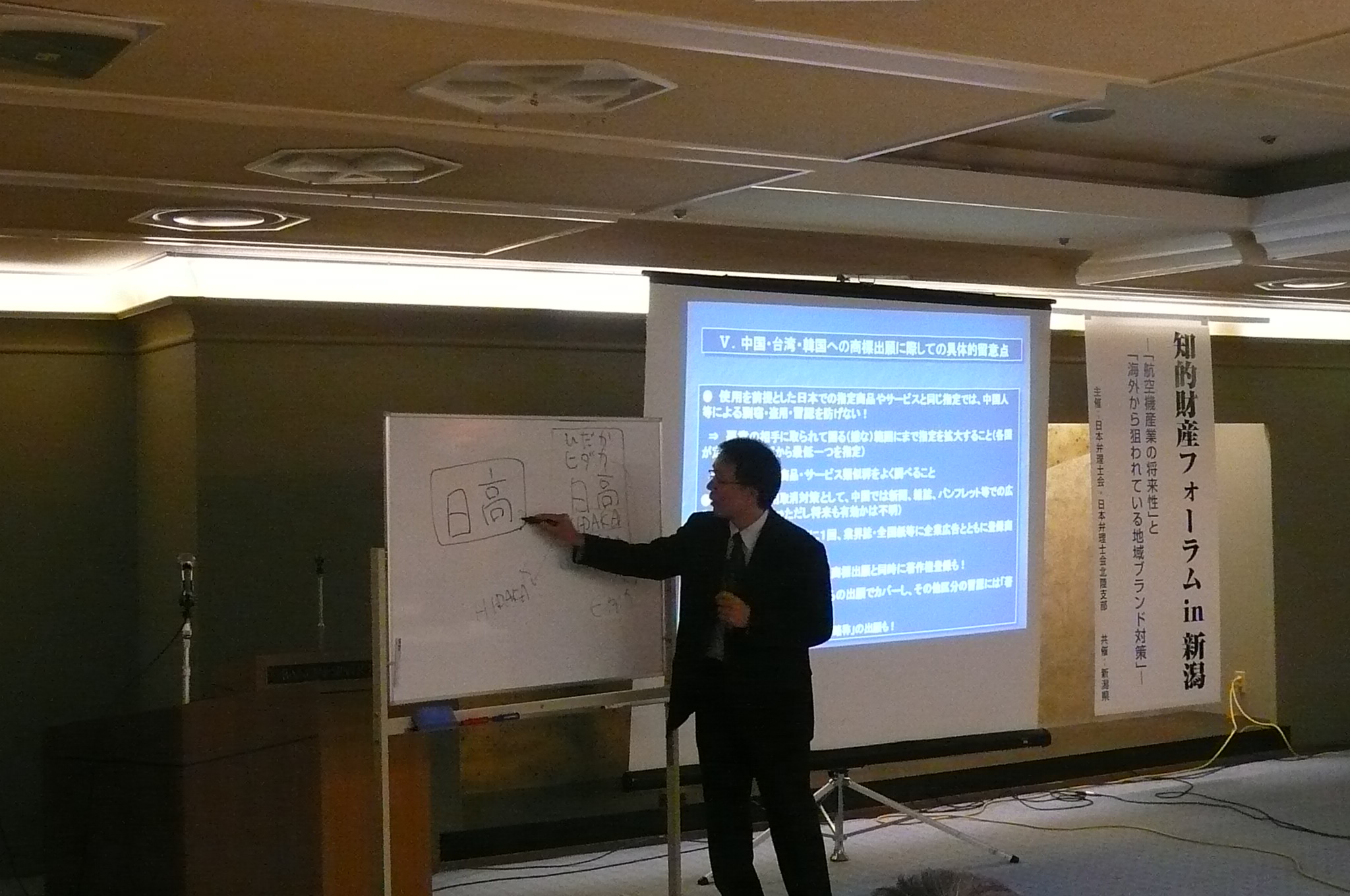講師:日高賢治氏(弁理士)によるご講演「アジア地域における地名の商標登録の現状と問題点・対処法」では、JETRO北京センター知財室長で経験された、中国の特殊事情などを、実例を挙げて説明されました。