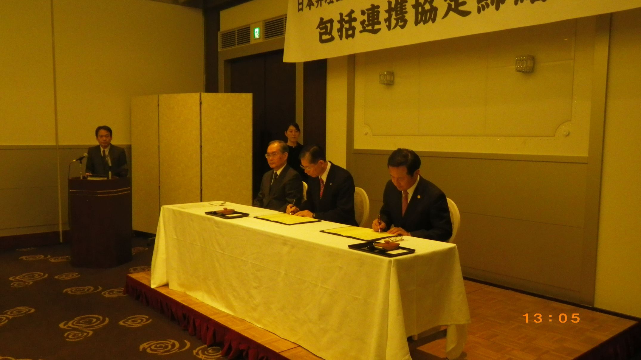 平成24年12月10日(月)、メルパルク熊本(熊本市中央区水道町)において、熊本高等専門学校など九州沖縄地区の9つの国立高等専門学校と当会は、知的財産分野で包括連携協定を締結した。奥山会長と高専代表の宮川熊本高専校長及び立居場有明高専校長が協定書に署名した。 締結式には弁理士や各高専の代表者ら約30名が参加した。