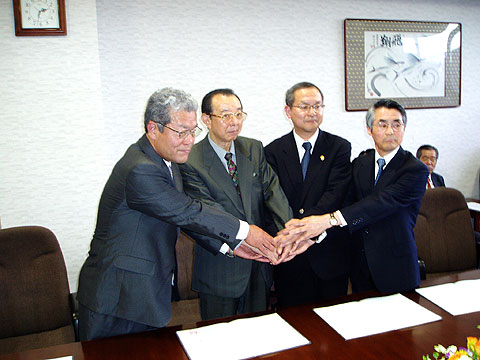 平成17年5月18日、島根県庁で、日本弁理士会・島根県・島根大学・松江工業高等専門学校の4者による、特許の取得と活用についての支援協定の調印式が行われました。