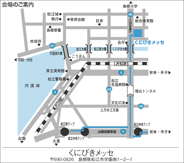| 場所 | 「くにびきメッセ」 〒690-0826松江市学園南1-2-1 (地図) TEL 0852-32-1903 FAX 0852-22-9219 |